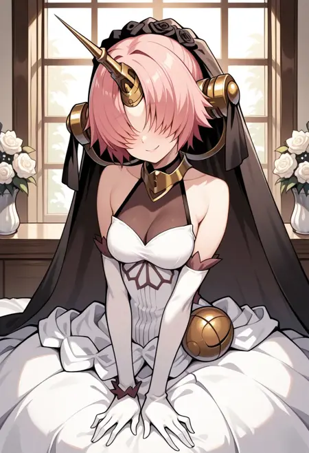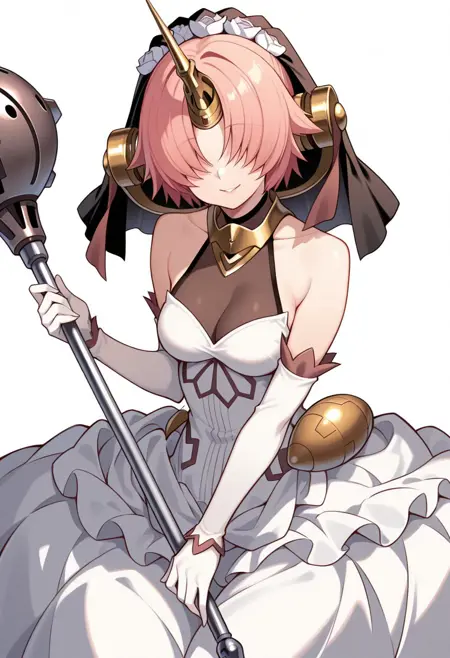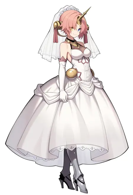触发词:frankensteinfate,短发,粉发,头发遮眼,异色瞳,蓝眼,黄眼,单角,机械角,头饰,中等胸部,发饰,发带,面纱,露肩,肘部手套,白手套,吊带装,透胸,白裙,婚纱,无袖裙,及膝靴,装甲靴,高跟鞋,