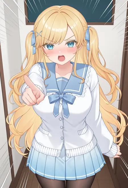 女式水手服,x 发饰,蓝丝带,蓝色水手领,白色开衫,蓝色丝带,渐变裙,蓝色裙摆,百褶裙,蕾丝镶边,连裤袜,