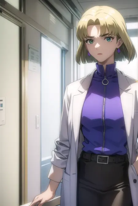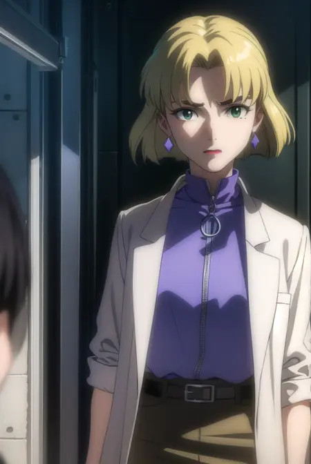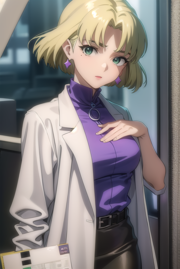 ritsuko akagi, 짧은 머리, 금발, 두더지, 눈 밑 두더지, (나눈 앞머리:1.5), (녹색 눈:1.5),