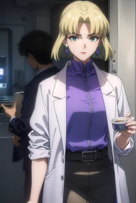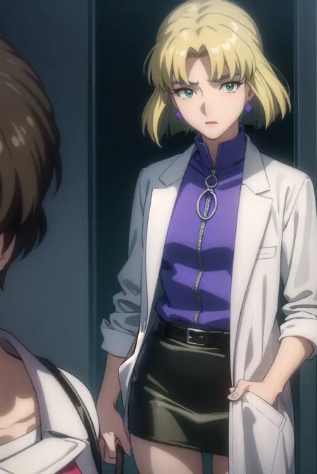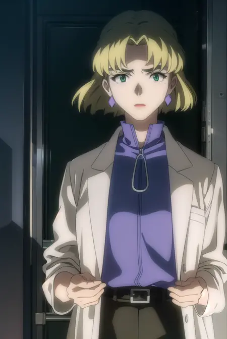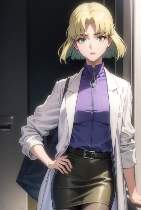 ritsuko akagi、短い髪、金髪、ほくろ、目の下のほくろ、(分け目のある前髪:1.5)、(緑の目:1.5)、