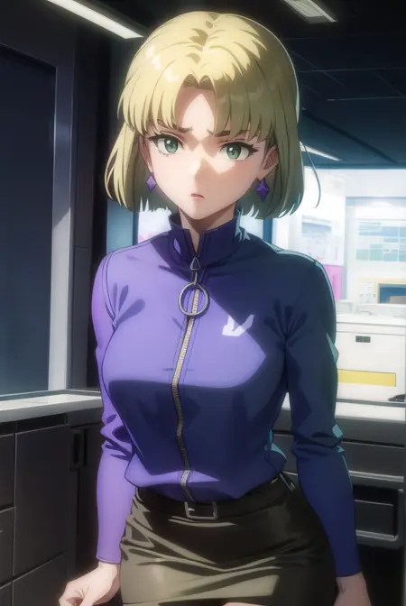 lipstick, skirt, jewelry, pantyhose, earrings, belt, pencil skirt, labcoat, shirt, purple shirt, turtleneck, zipper,