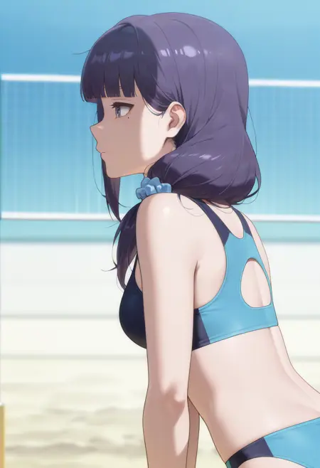 • Tags for her look: 1girl, solo, medium breasts, long hair, purple hair, hair ornament, purple eyes, blunt bangs, side ponytail, mole under eye, hair over shoulder, low ponytail, hair scrunchie, blue scrunchie,