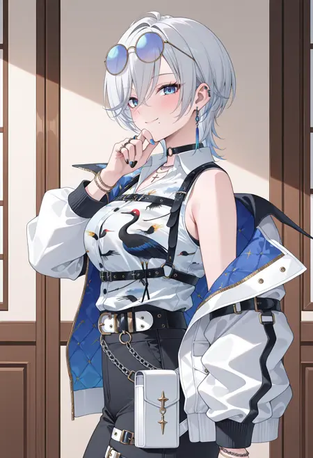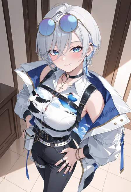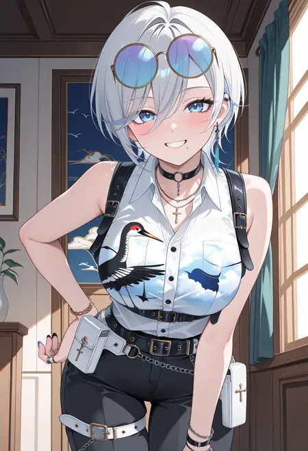 圆环项圈,黑色项圈,多条项链,拉丁十字,胸背带,胸带,有领衬衫,印花衬衫,天空印花,鸟类印花,鹤印花,无袖衬衫,内搭衬衫,胸背带,黑色长裤,白色夹克,双面夹克,多个戒指,手镯,多条腰带,白色腰带,黑色腰带,腰带包,白色包,链条,黑色长裤,大腿带,宽松长裤,开口长裤,拉链拉头,脚链,