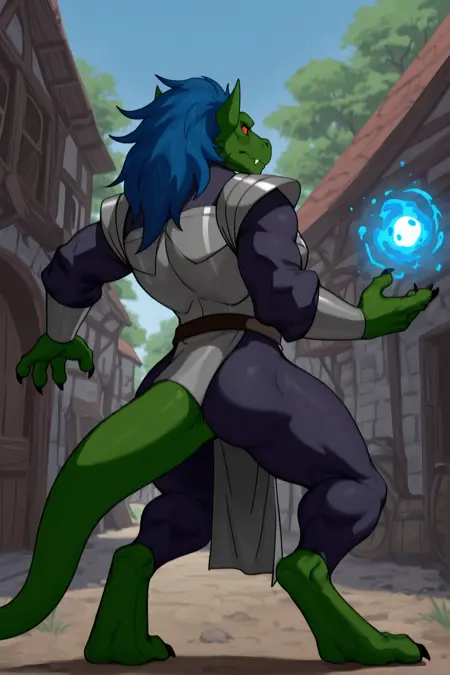 | トレーニングワード | l1ng_r3pt1l3_TL0TD, anthro, earless, red sclera, slit pupils, scalie, snout, solo, female, snout, parted lips, teeth, breasts, belt, green body, swept bangs, blue hair, armor, steel shoulder pads, navy blue skinsuit, mane, long hair, steel bracelet, grey pelvic curtain, breastplate, 4 fingers,コピーしました! full-length portrait, digitigrade, barefoot, 4 toes,コピーしました! |
