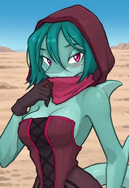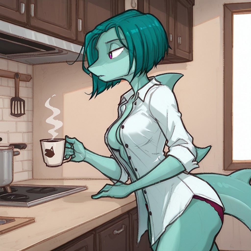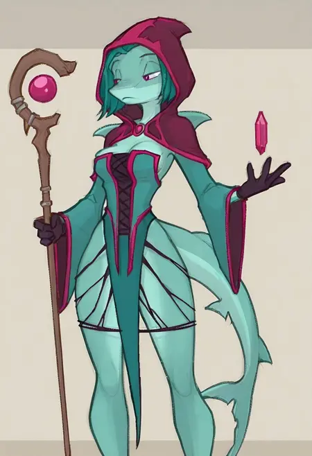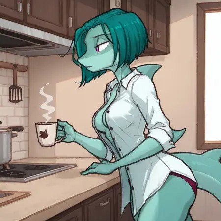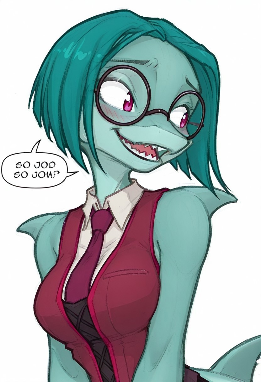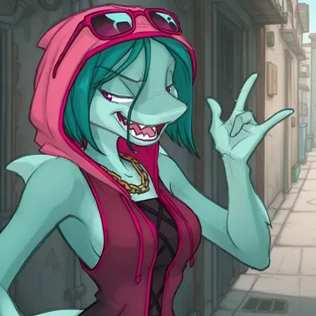 rsmr_dk, 1girl, solo, furry, furry female, short hair, colored skin, breasts, green hair, green skin, medium breasts, shark tail, purple eyes, pink eyes,