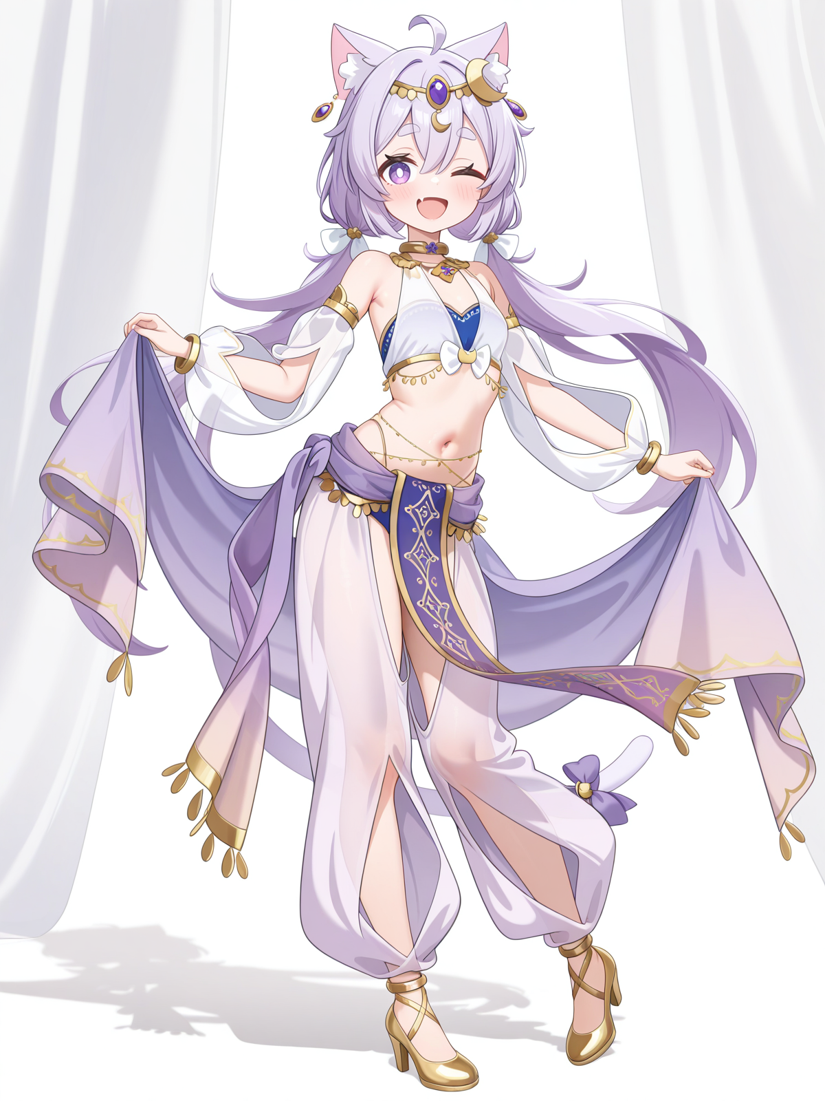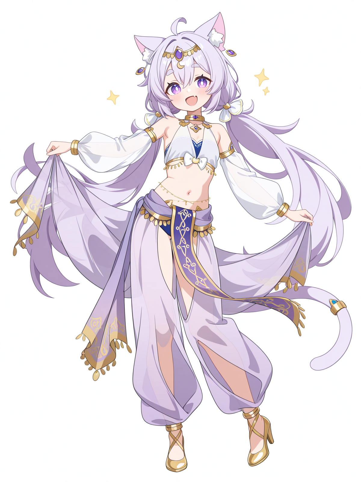 salt arabian,child,petite,ahoge,bangs,hair between eyes,twintails,low twintails,hair ornament,light purple hair,purple hair,light_purple_ears,cat ears,animal ear fluff,thick eyebrows,purple eyes,white pupils,skin fang,cat tail,tail ornament,tail,small breasts,see-through,arabian clothes,midriff,harem outfit,detached sleeves,dancer,navel,harem pants,pants,high heels,gold footwear,jewelry,