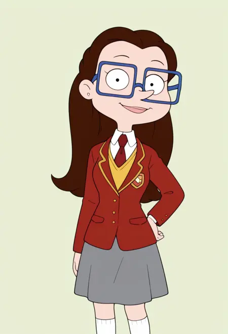 Carla/Beth, 1girl, solo, black hair, blue-framed eyewear, glasses, long nose, pink lipstick medium breasts