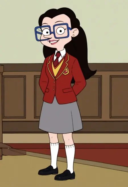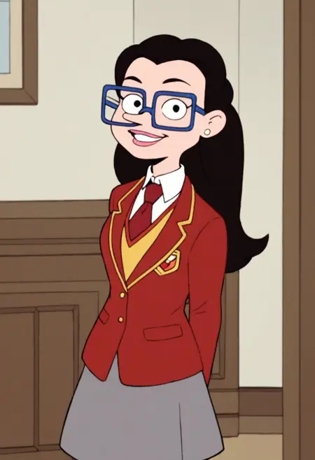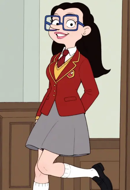 Carla/Beth, 1girl, solo, black hair, blue-framed eyewear, glasses, long nose, pink lipstick medium breasts