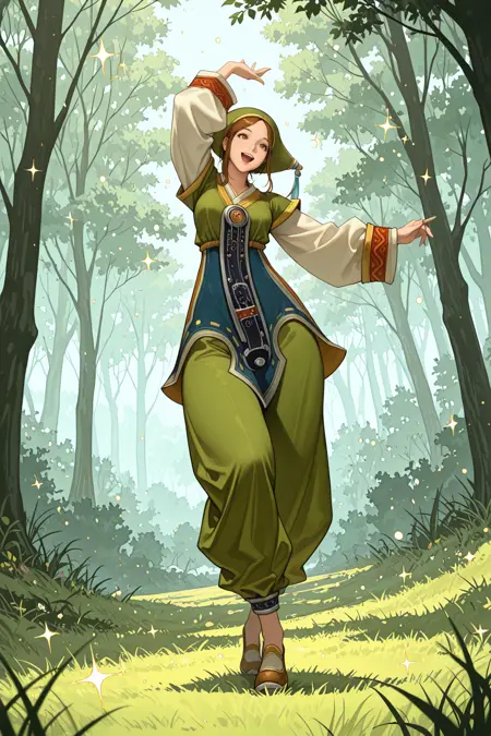 触发词:shelinda,棕色头发,长发,中分刘海,棕色眼睛,绿色帽子,帽饰,短外套,长袖,宽松裤子,绿色裤子,鞋子
