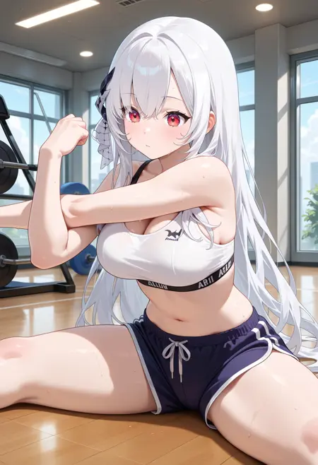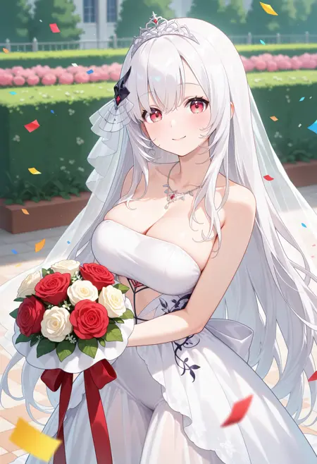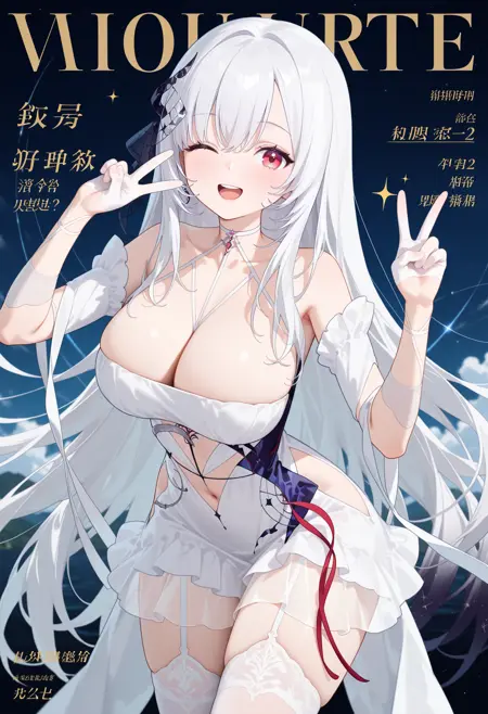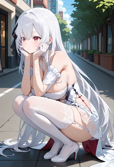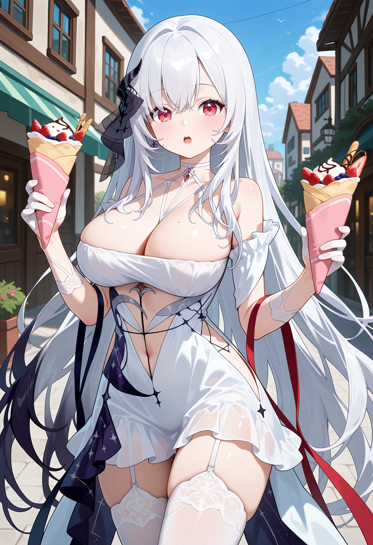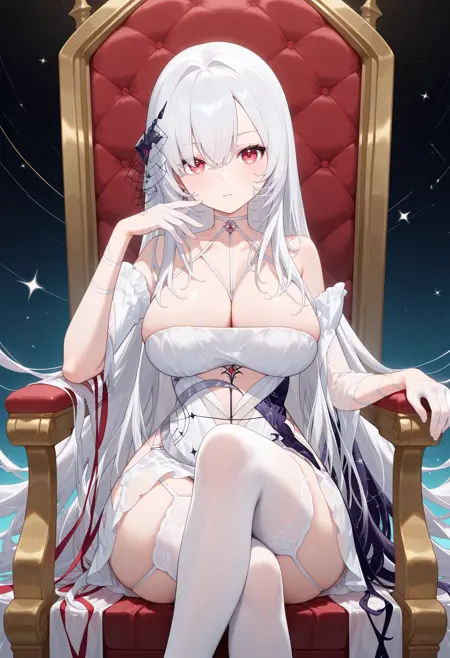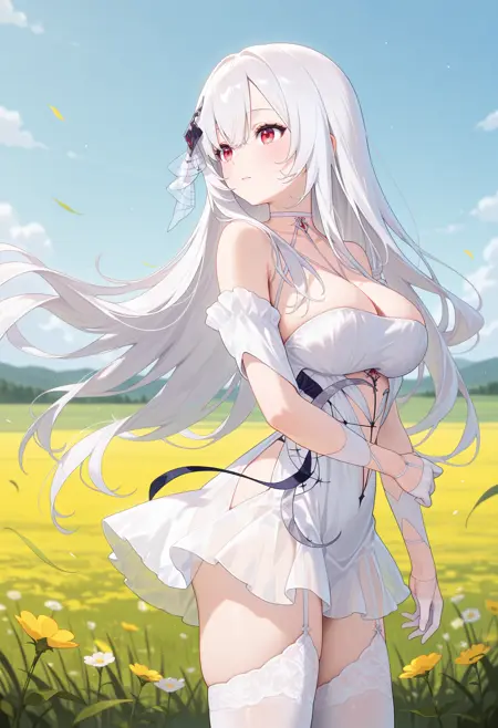 outfit1aaeare, long hair, white hair, hair ornament, red eyes, white choker, bare shoulders, clothing cutout, cleavage, white dress, detached sleeves, white gloves, see-through, hip vent, garter straps, white thighhighs