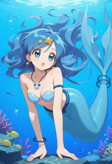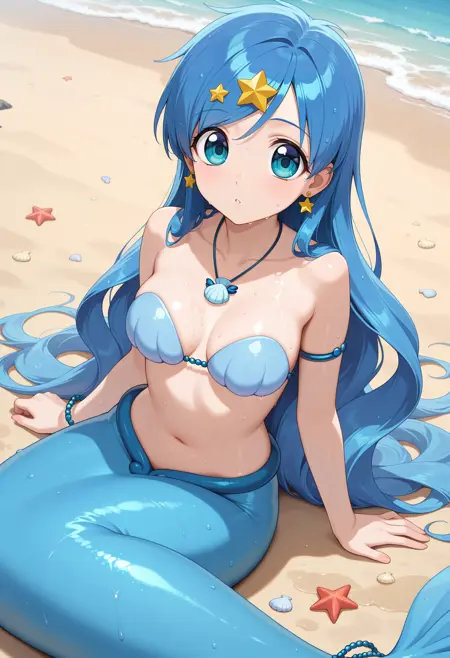 aahanon, long hair, blue hair, star hair ornament, mermaid, star earrings, blue eyes, necklace, bikini top only, shell bikini, blue bikini, armlet, single bracelet