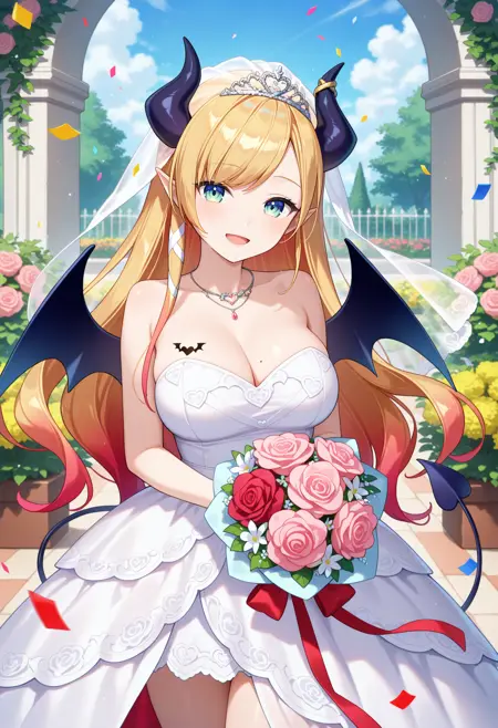 outfit6 (완벽하지 않음)ffchoco, 긴 머리, 금발, 플랫테일, 머리 리본, 땋은 머리, 악마 뿔, 둔한 앞머리, 날개, 악마 꼬리, 데클레보, 목걸이, 가슴 문신, 투명, 젖가슴 노출, 흰 드레스, 긴 소매