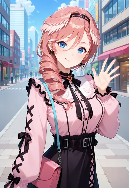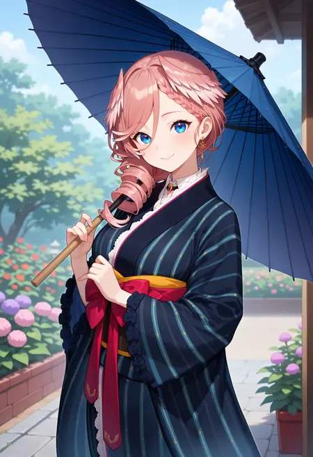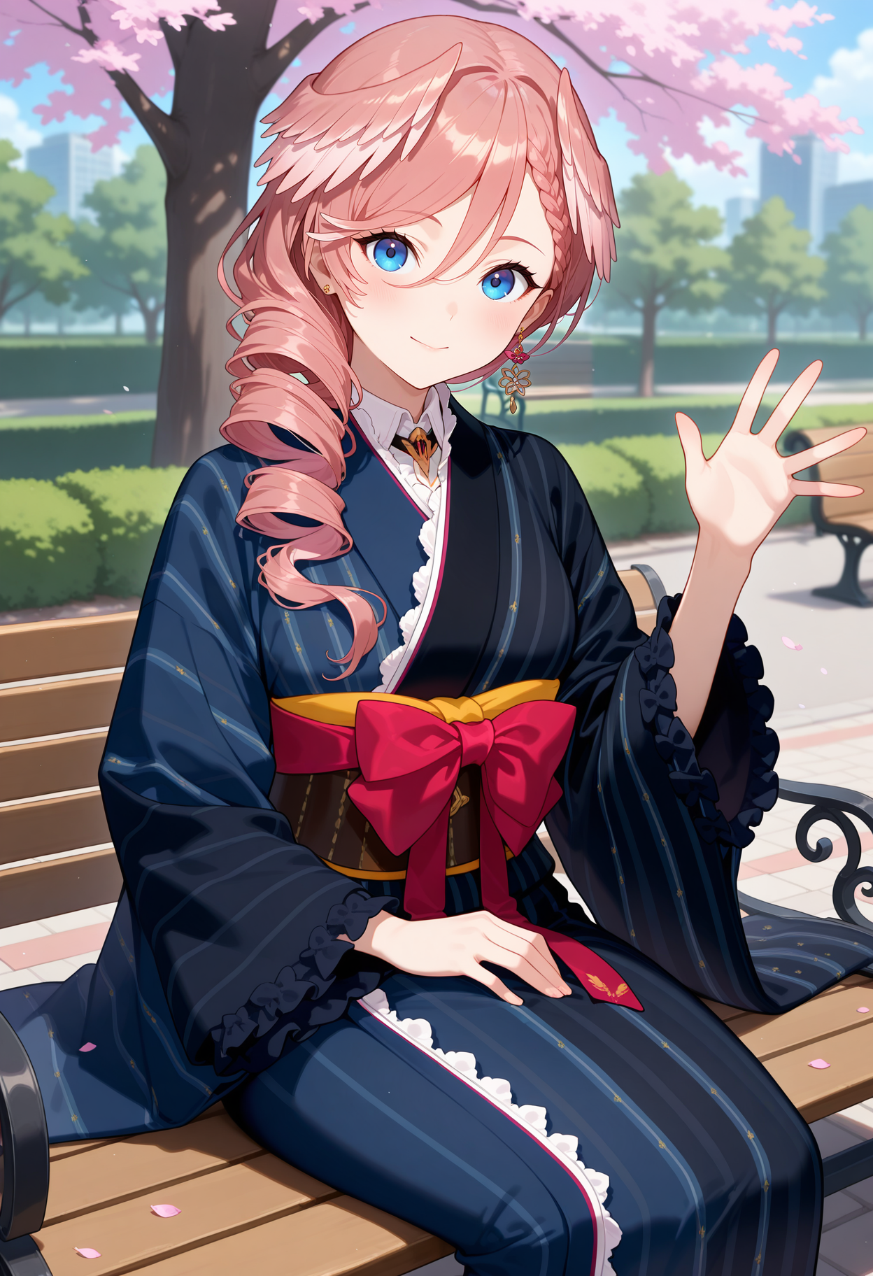 outfit2bblui, long hair, pink hair, drill hair, head wings, hair over shoulder, braided bangs, earrings, blue eyes, striped kimono, black kimono, long sleeves, wide sleeves, red bow, obi, sash