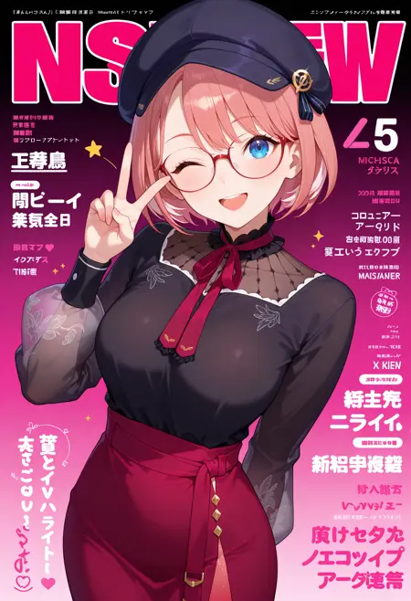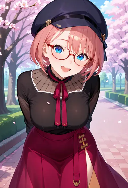 outfit3cclui, short hair, pink hair, newsboy cap, black headwear, glasses, blue eyes, neck ribbon, see-through, black shirt, long sleeves, high-waist skirt, long skirt, red skirt