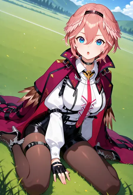 outfit1-1aalui, short hair, pink hair, head wings, black hairband, blue eyes, black choker, coat on shoulders, red necktie, collared shirt, white shirt, long sleeves, fingerless gloves, black gloves, high-waist shorts, black shorts, thigh strap, brown pantyhose