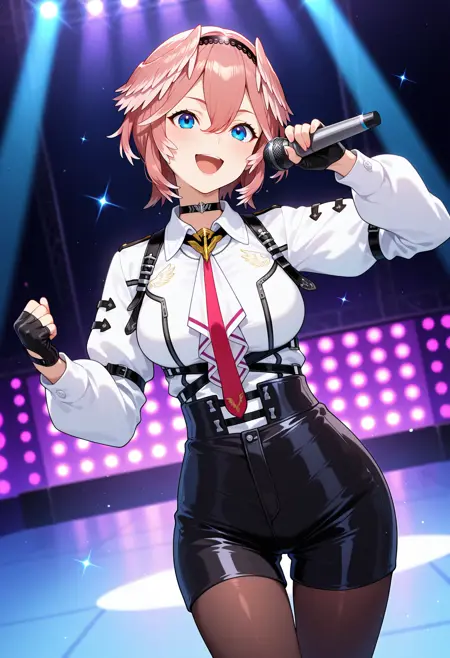 outfit1-2aalui, short hair, pink hair, head wings, black hairband, blue eyes, black choker, red necktie, collared shirt, white shirt, long sleeves, fingerless gloves, black gloves, high-waist shorts, black shorts, brown pantyhose