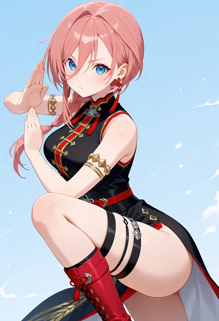 outfit4ddlui, long hair, pink hair, earrings, blue eyes, hair over shoulder, china dress, black dress, sleeveless, armlet, side slit, thigh strap
