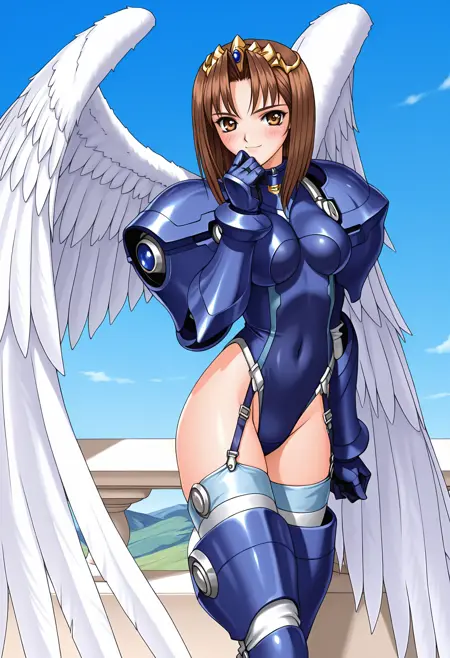 - armored leotard, shoulder armor, gauntlets, gloves, covered navel, armored boots, garter straps, blue leotard, blue footwear, feathered wings,