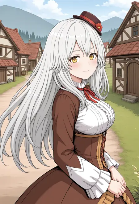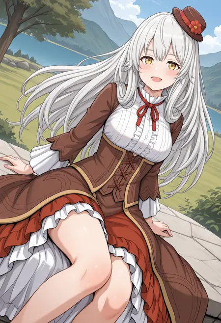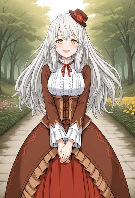 • 小帽子,帽饰花,红色丝带,颈饰丝带,衬衫,中间荷叶边,棕色束腰,棕色长裙,长裙,层叠裙,红色裙子,