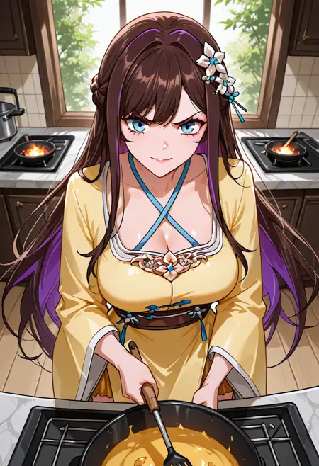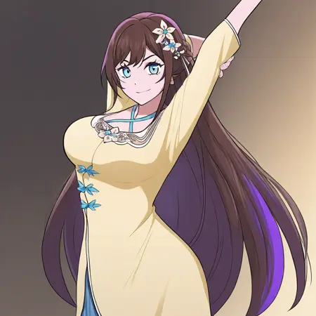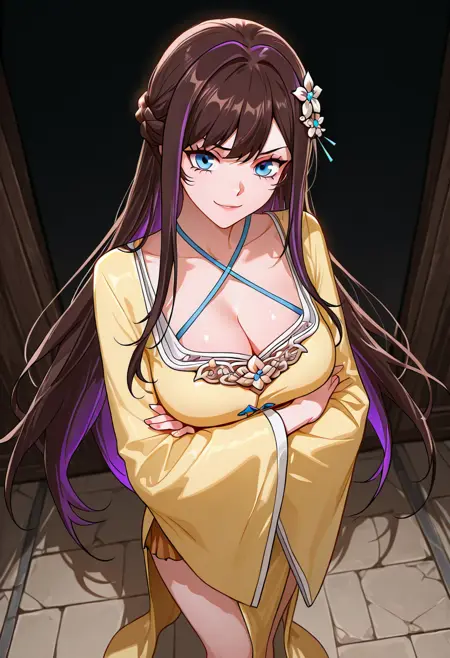 Yang xue, yang xue,1girl,solo,long hair,very long hair,brown hair,dark brown hair,purple highlights,blue eyes,light blue eyes,large breasts,hair ornament,flower hair ornament,white flower,