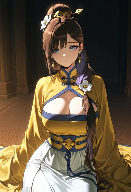 1girl, solo,long hair, very long hair, brown hair, dark brown hair, purple highlights,blue eyes, light blue eyes,large breasts,hair ornament, flower hair ornament, white flower,