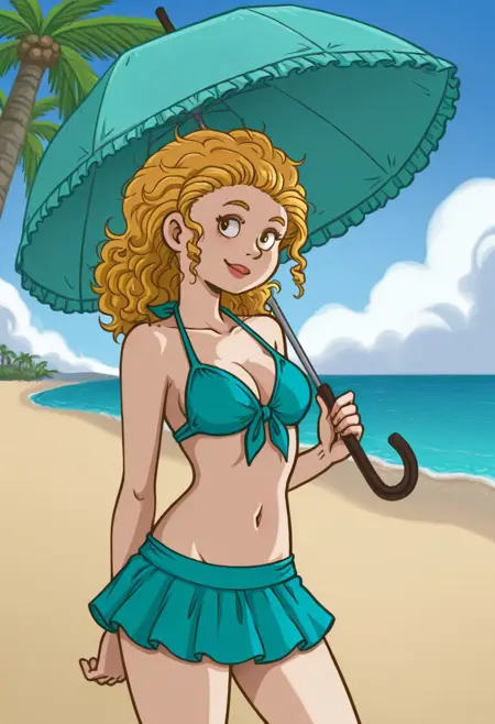 プロンプト: deedee dawkins, blonde hair, curly hair, red bandana, polka dot bandana, headkerchief, cyan spacesuit, gloves, belt, boots, coffee mug