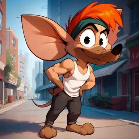 dog, chihuahua, brown fur, black eyes, orange hair, black nose, dark brown snout, dark brown paws, large dog ears, thin dog tail, green head band,