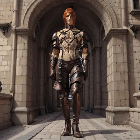 over-the-knee boots, a metal collar, a metal collar connected by chains to small metal parts on the body, dark brown metal, dark brown metal shoulder pads, high leather gloves with cuffs, body visible, tattoos on the chest and stomach, brown leather pants, high heeled boots with cuffs,