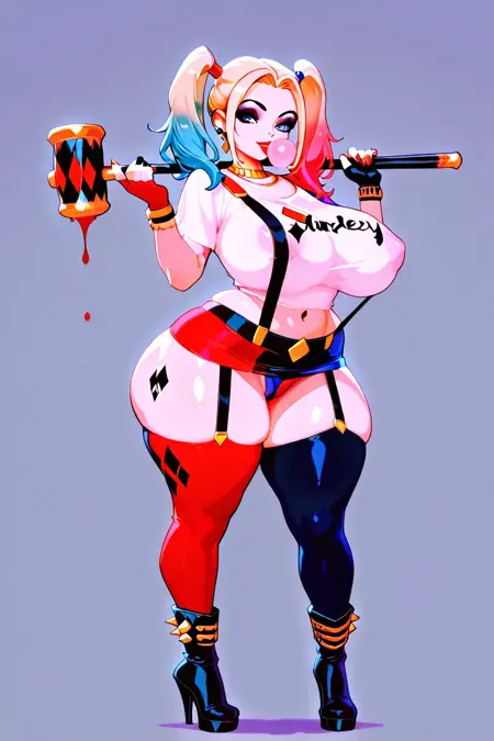 1girl, Harley Quinn, blue eyes, blonde hair twin tails, multi colored hair, lipstick, eyeliner, makeup, tattoo