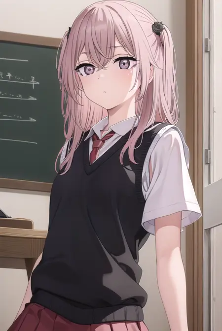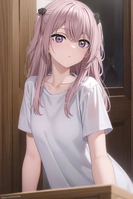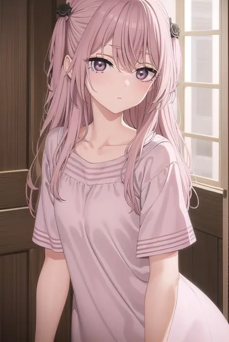 sajuna inui, 긴 머리, 앞머리, 머리 장식, 눈 사이의 머리카락, 분홍색 머리, 꽃 모양의 머리카락, (분홍색 눈:1.5), 양쪽 올린 머리, 교차한 앞머리, 검은 꽃, 검은 장미,