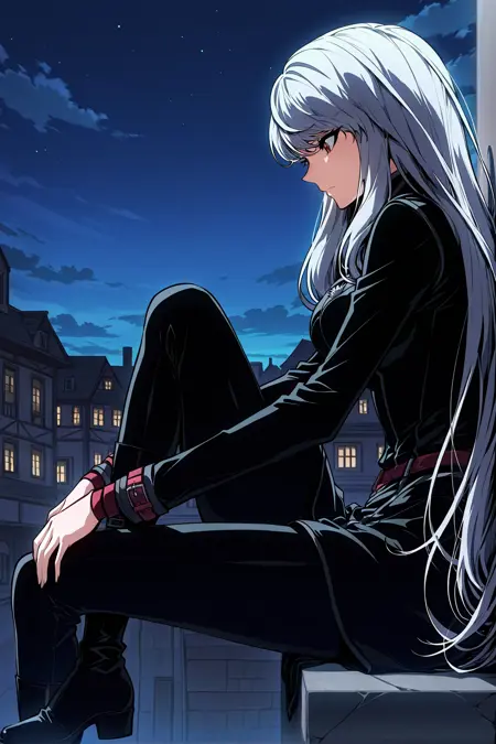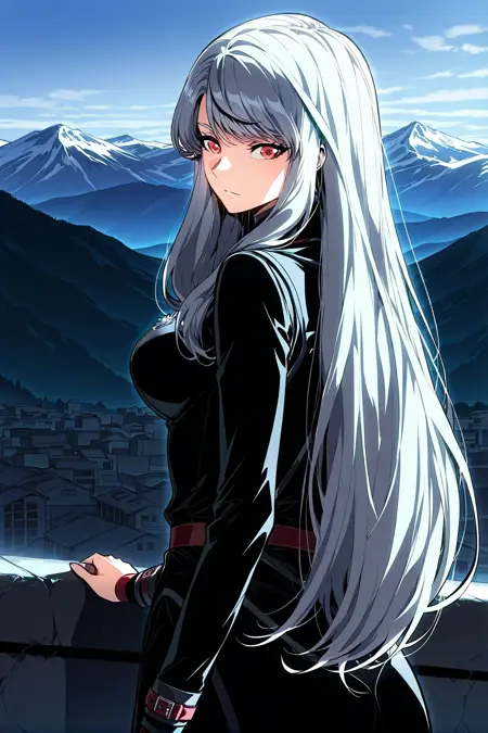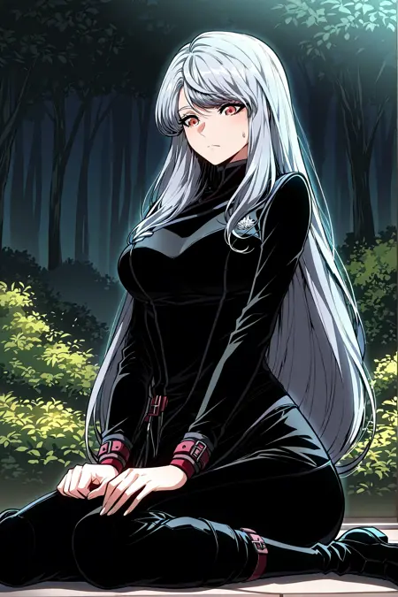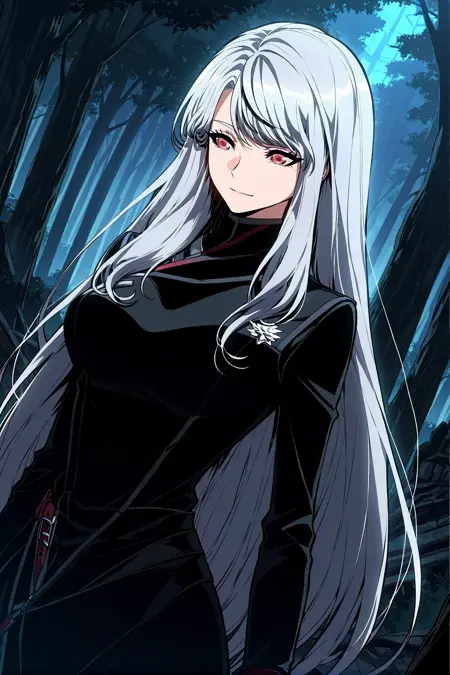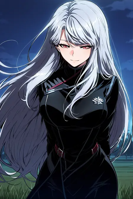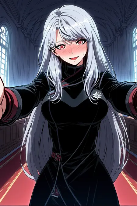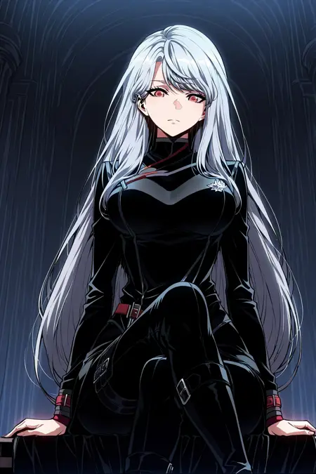 Lilianv2, 1girl, solo, red eyes, silver hair, long hair, straight hair, side swept bangs, thick bangs, long bangs, hair between eyes, long sidelocks,