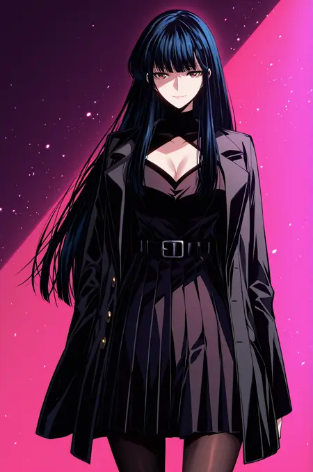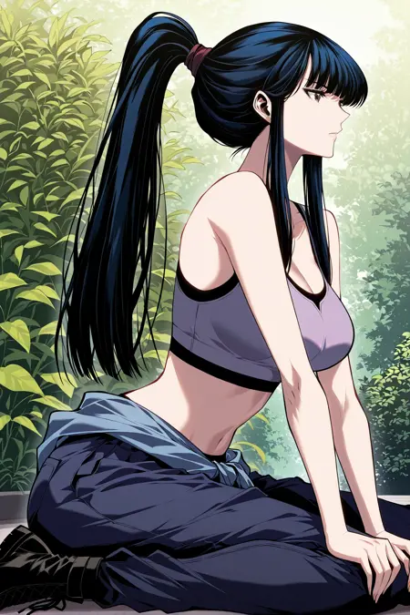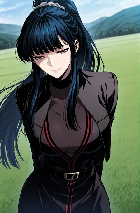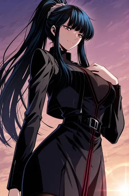 지젤, 1소녀, 솔로, 붉은 갈색 눈, 진한 파란색 머리, 긴 머리, 곧은 머리, 곧은 앞머리, 눈 사이의 머리, 긴 옆머리, 높은 폰테일, 가벼운 스러ン치,