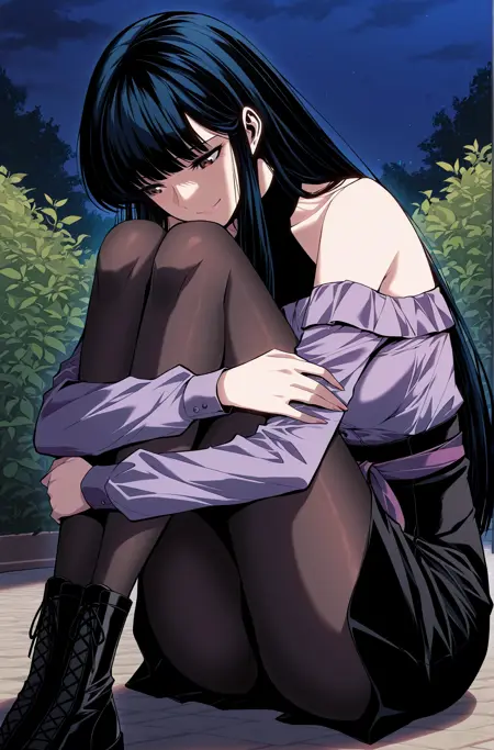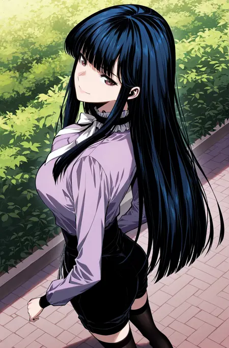 지젤, 1소녀, 솔로, 붉은 갈색 눈, 진한 파란색 머리, 긴 머리, 곧은 머리, 곧은 앞머리, 눈 사이의 머리, 긴 옆머리, 높은 폰테일, 뒤로 묶음,