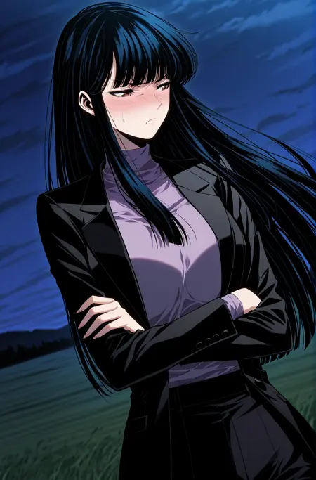 지젤_아우트핏6, 검은 블레이저, 열린 블레이저, 보라색 셔츠, 보라색 터틀넥, 검은 바지, 꼭 맞는 바지, 검은 하이힐,