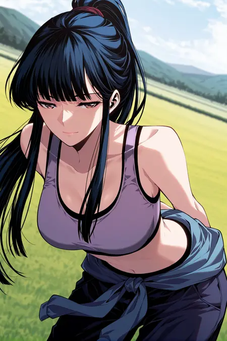 지젤_아우트핏5, 보라색 크롭탑, 검은 스포츠 브라, 복부, 파란색 재킷, 허리에 묶인 재킷, 진한 파란색 바지, 풀어진 바지, 검은 부츠,
