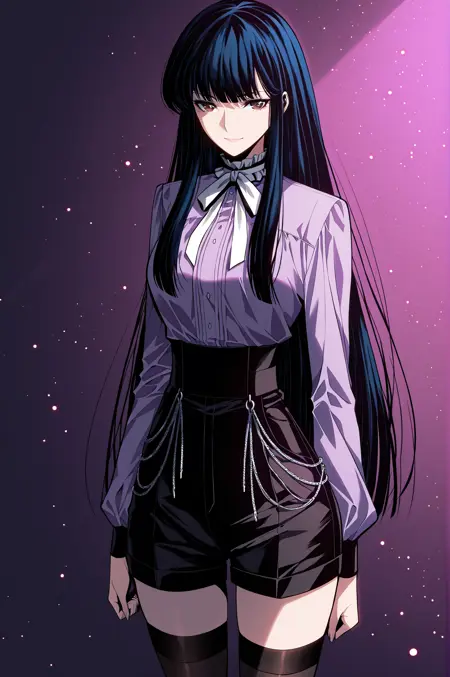 지젤_아우트핏4, 보라색 블라우스, 긴 소매, 프릴 치코, 흰색 프릴, 목에 검은 리본, 검은 숏팬츠, 높은 허리 숏팬츠, 검은 손목밴드, 검은 히그, 검은 발목부츠, 숏팬츠에 은색 체인