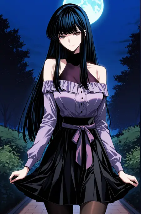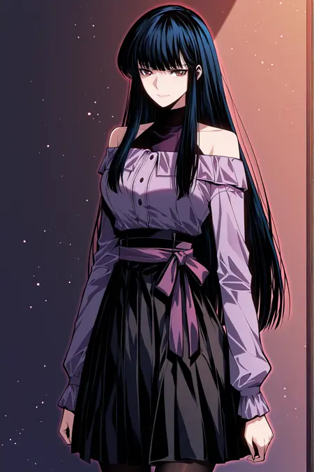 지젤_아우트핏3, 어깨 드리워진 셔츠, 보라색 셔츠, 단추 셔츠, 긴 소매, 안상의, 검은 상의, 할터탑, 높은 칼라, 높은 허리 스커트, 검은 스커트, 매듭 벨트, 보라색 벨트, 검은 팬티후스, 검은 부츠