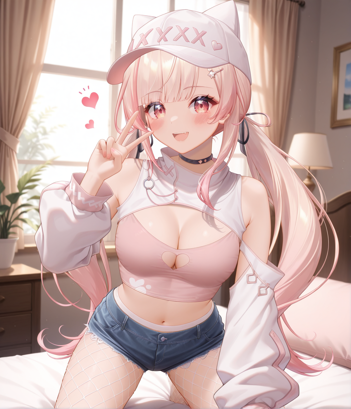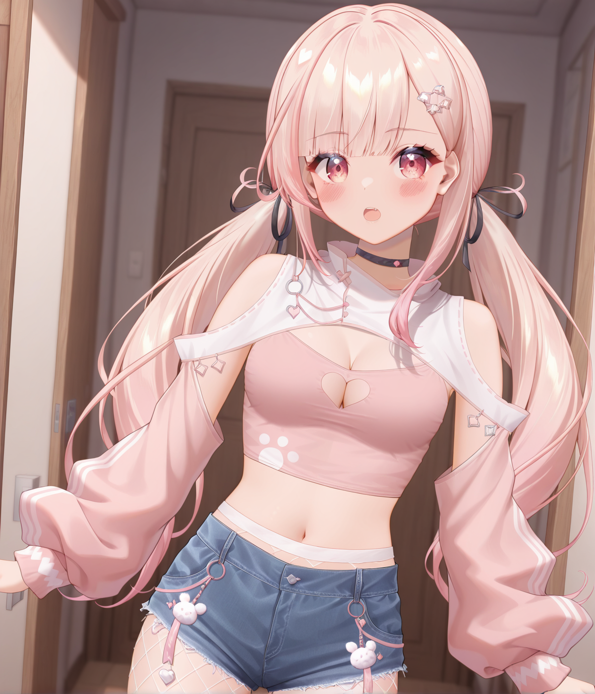 | トレーニングワード | 1girl,pink hair, gradient hair, hair ornament, red eyes, gradient eyes,コピーしました! pink tube top, mini shorts, fishnet pantyhose, bare shoulders, spaghetti strap, choker,cleavage, cleavage cutout, detached sleeves, navel,コピーしました! white short shirt, cutout,navel, black skirt, neck ribbon,buttons,black thighhighs, thigh strap,コピーしました! |