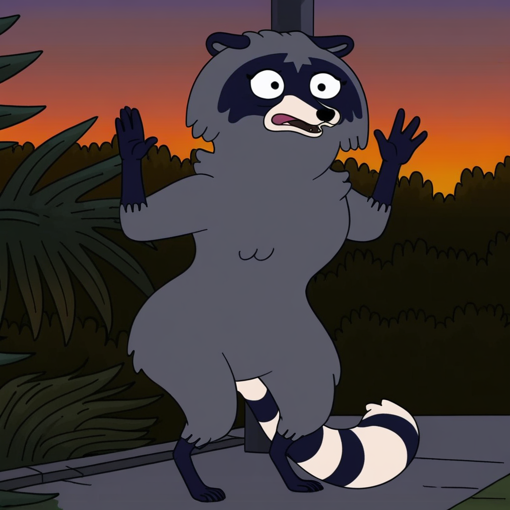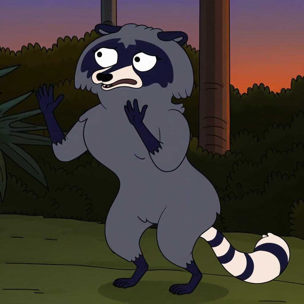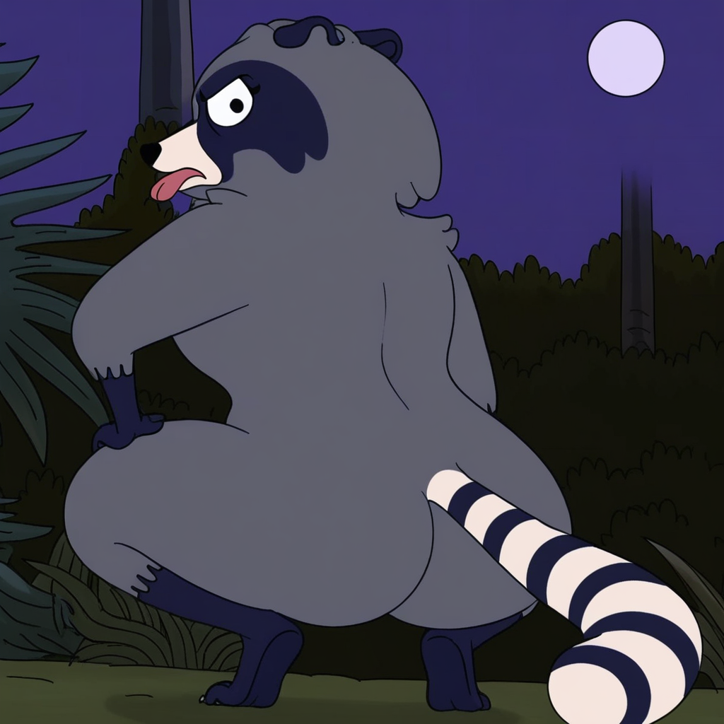 プロンプト: アライグマの元カノ、ツートーンのアライグマの尾、野生的、単体