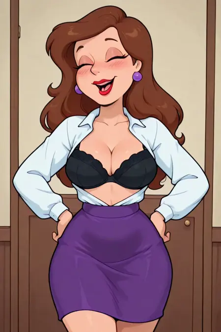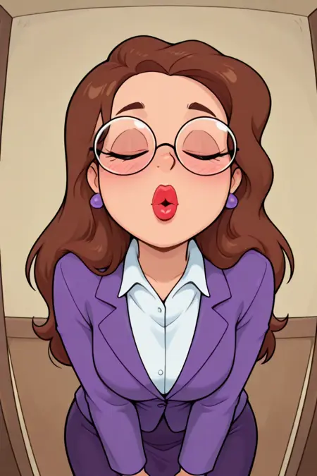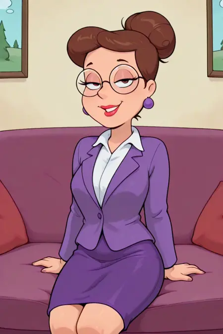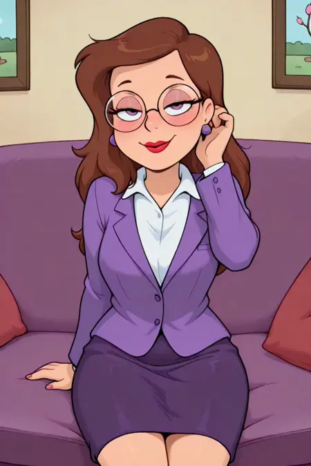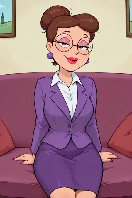 茶色の髪、メイク、片側の髪の結び目、髪の結び目、スカート、眼鏡、イヤリング、丸型の眼鏡、シャツ、ジャケット、衿付きシャツ、スーツ、長袖、ジュエリー、リップスティック、白いシャツ、紫のジャケット、ペンシルスカート、赤い唇、紫のスカート、紫のハイヒール