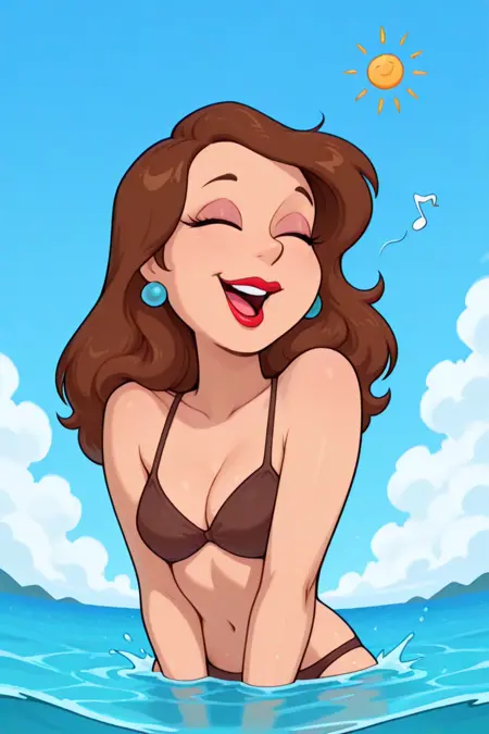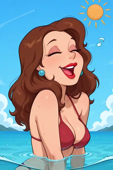 長めの茶色の肩までの髪、メイク、スカート、イヤリング、ジュエリー、リップスティック、へそ、ブラ、黒いブラ、大きな胸、胸元、パンティ、赤い唇、黒いパンティ