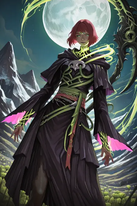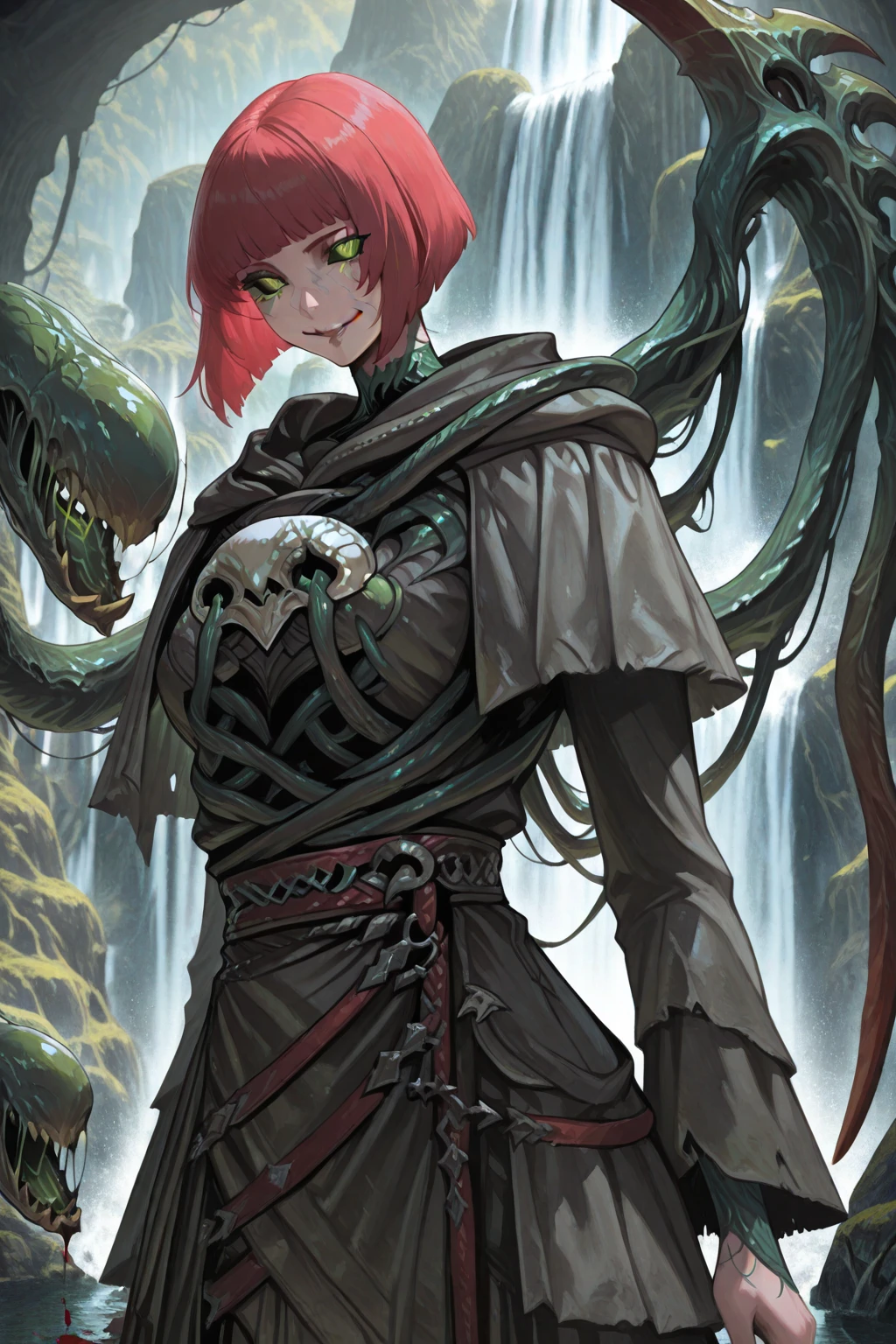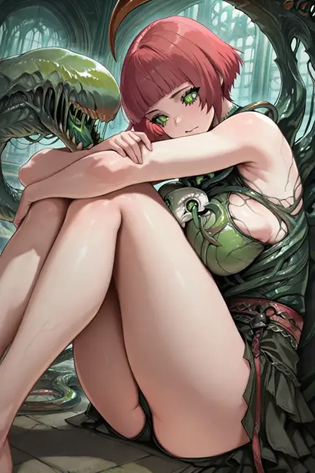 1girl, Hegemone, short hair, blunt bangs, red hair, emerald green eyes, wing, back monstrous appendage