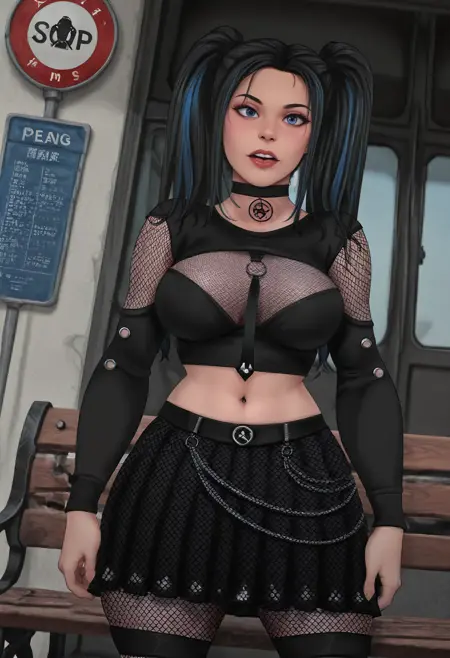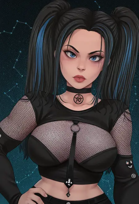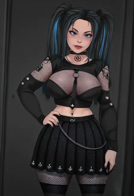 fishnet top, black shirt, crop top, fishnet pantyhose, black skirt, pleated skirt, black thighhighs, pentacle choker, black choker,