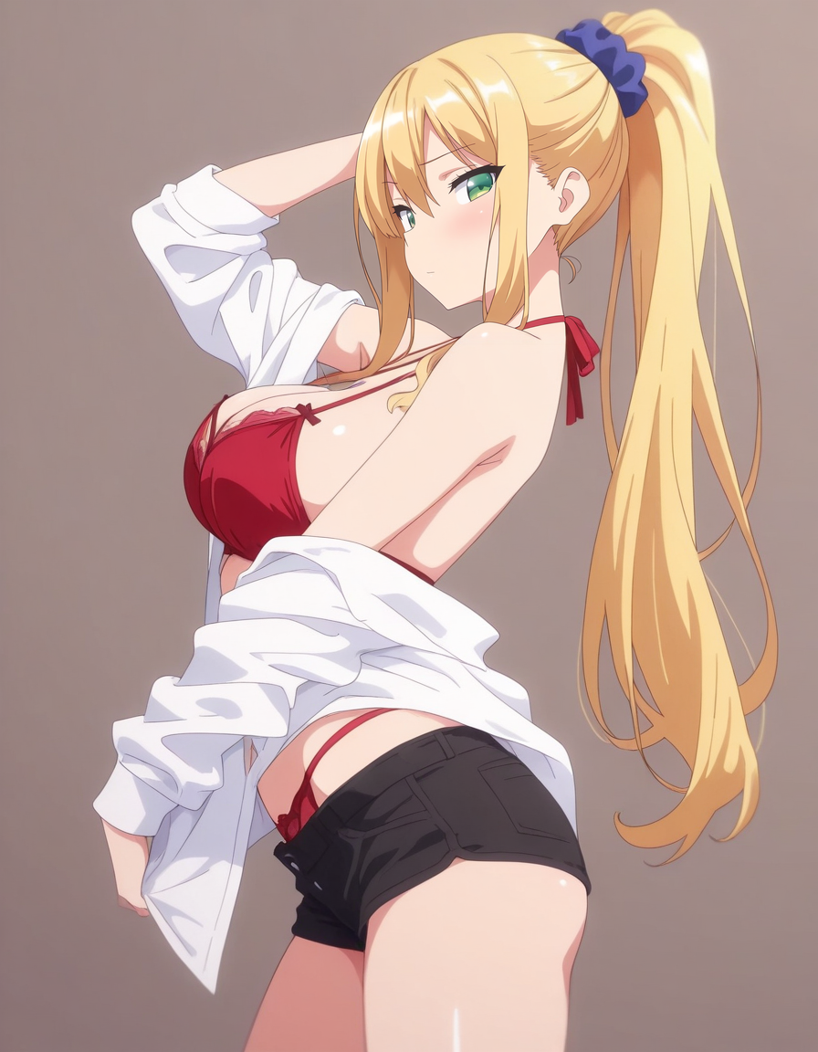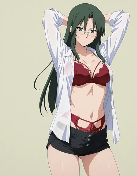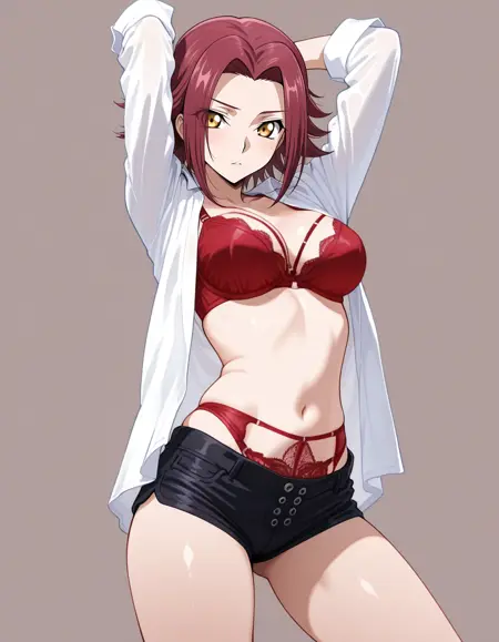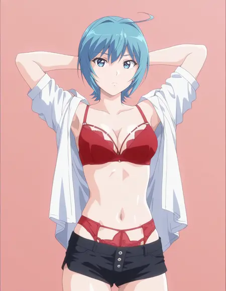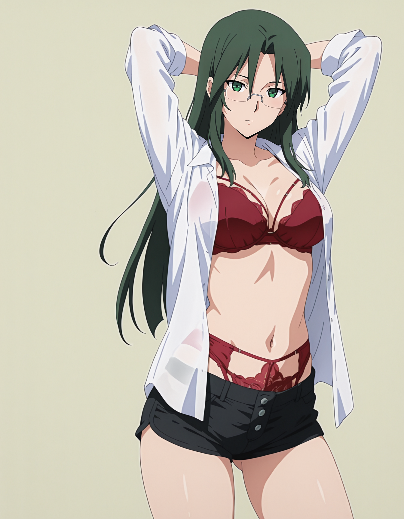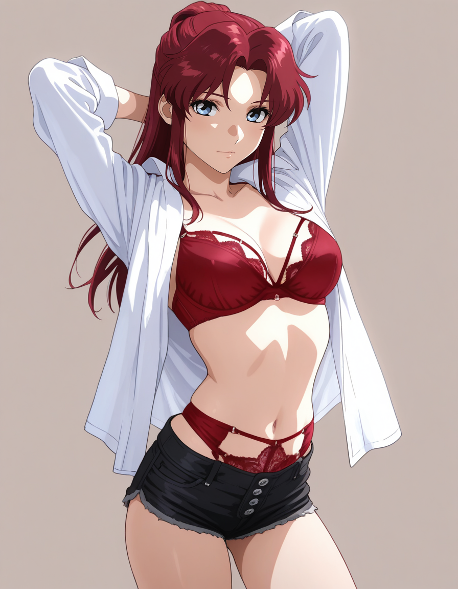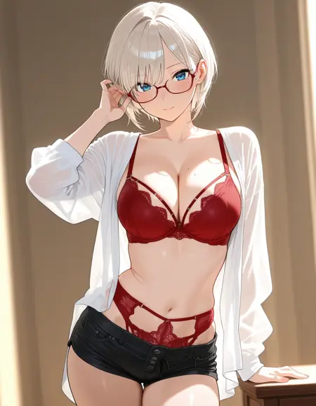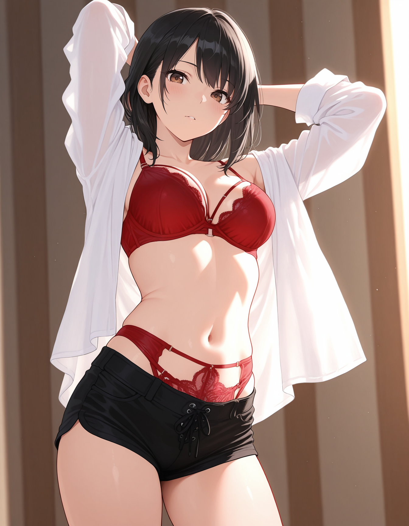 mai_bjc_rbp,red_lace_bra,white_shirt,red_lace_panties,black_denim_shorts