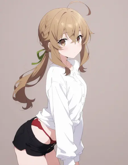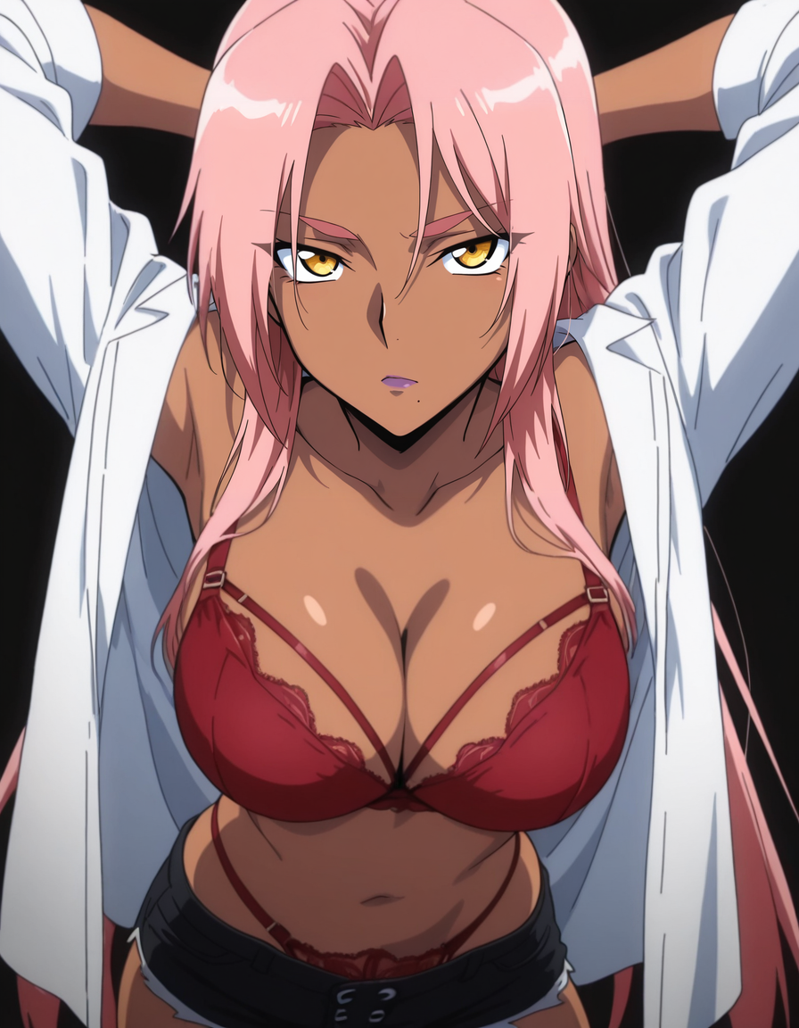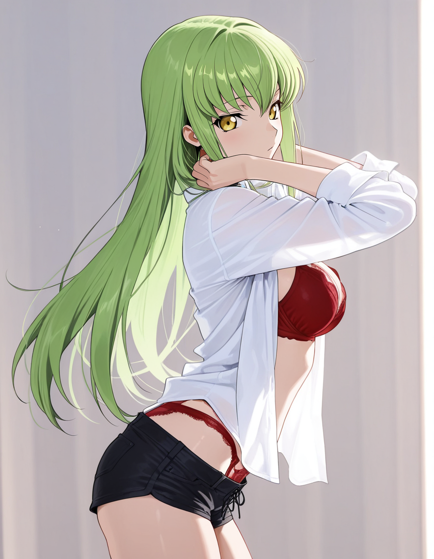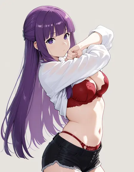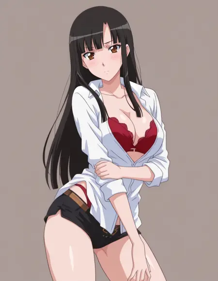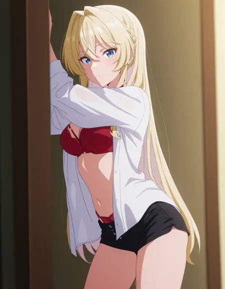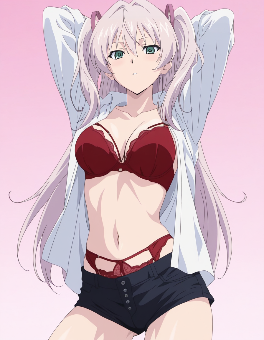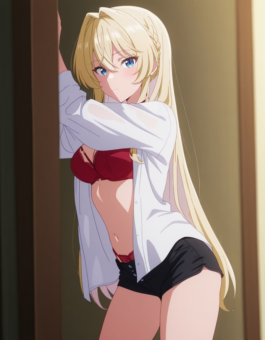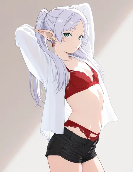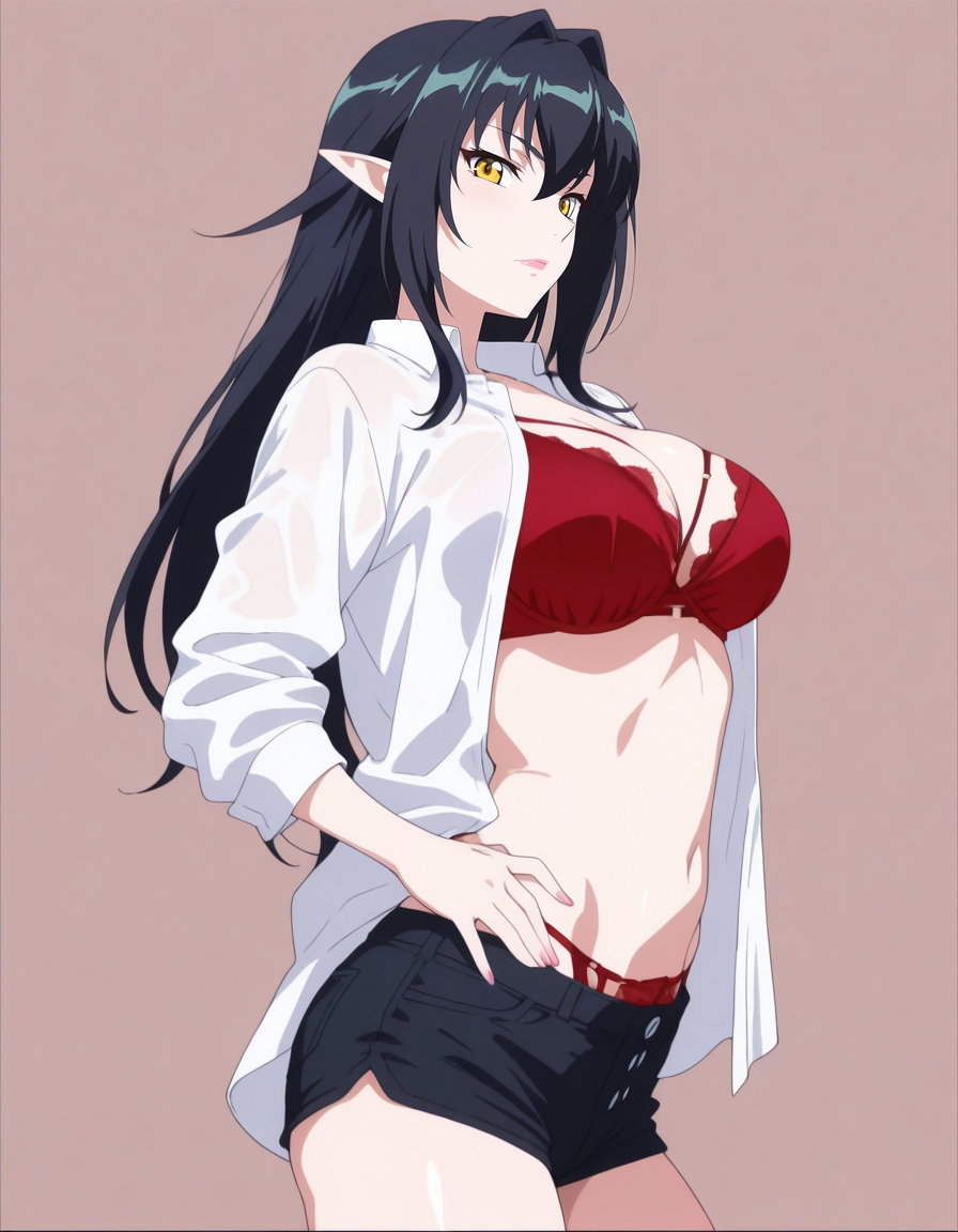mai_bjc_rbp,red_lace_bra,white_shirt,red_lace_panties,black_denim_shorts