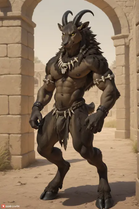 g04tm4n, goat hybrid, brown fur, yellow eyes,