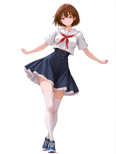 制服 : White_sailor_suit, Red_tie, Short sleeves, ((dark blue_skirt)), White_lace_ruffle_skirt,white_thighhighs, zettai_ryouiki,