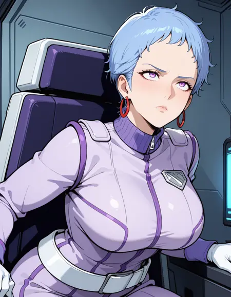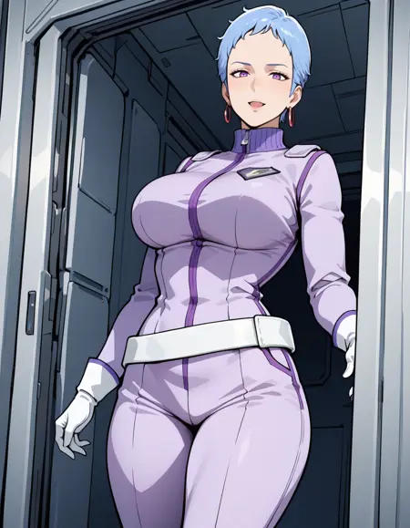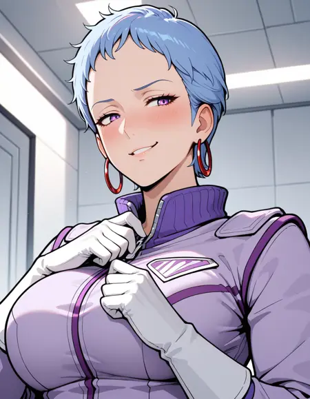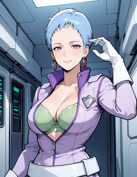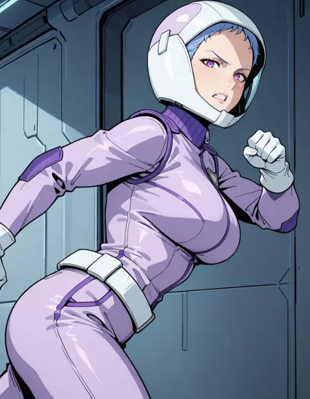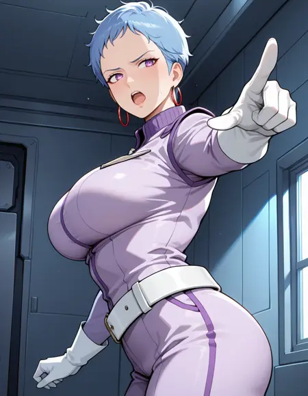 | 训练词汇 | (elizabeth-clabery), (official style, science fiction, dark purple eyes, blue hair, very short hair, messy hair, mature female, large breasts), (light purple jumpsuit, white gloves, white belt, white high heel boots), (red hoop earrings)已复制! (unzipped), (green bra, cleavage)已复制! (helmet, no earrings), (jetpack)已复制! |