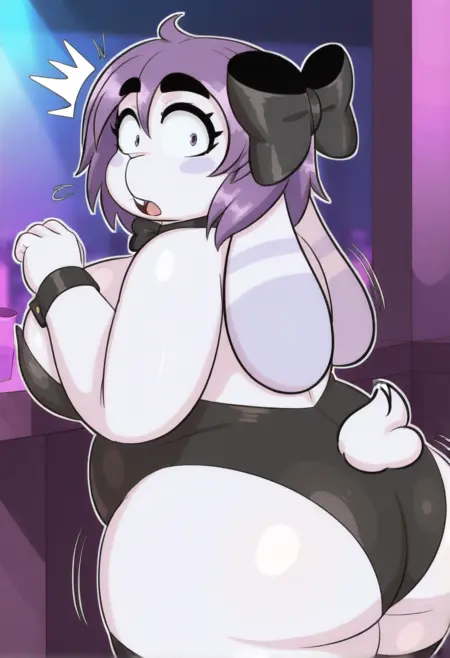キャラクタータグ: anthro, furry, bunny girl, lop ears, lilac fur, purple hair, bushy eyebrows, fluffy tail