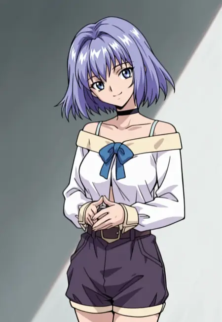 肩出しシャツ、長袖、ブラストラップ、リボン、ショートパンツ、ベルト、チョーカー